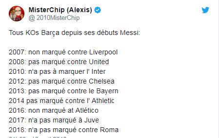 وأشارت الإحصائيات أنه في كل مرة لايسجل فيها ميسي في الدور الربع النهائي، يعرف إقصاء النادي الكتالوني.