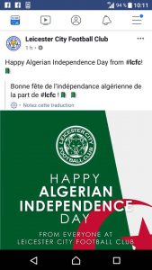 هنأ نادي ليستر سيتي الجزائريين ، بعيد الإستقلال، المصادف ليوم 5 جويلية، وذلك عبر الصفحة الرسمية للنادي على “فايسبوك”.