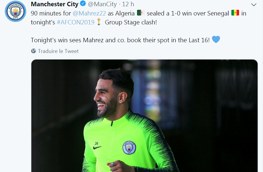 وجاء في التغريدة : “90 دقيقة أخرى لـ رياض محرز مع منتخب الجزائر أمام السنغال وفوز بهدف دون رد في قمة دور المجموعات”